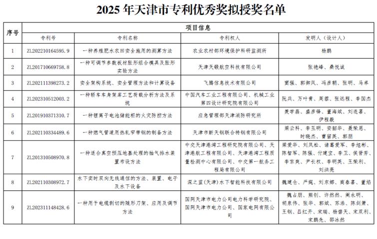 2025年天津市专利奖经申报阶段公示、形式审查、专业评审组初评、征求意见、初评后公示、专利奖评审委员会复评、市知识产权局党组会审定等程序,确定拟授奖项目100项,其中:金奖20项、优秀奖79项、创业奖1项。